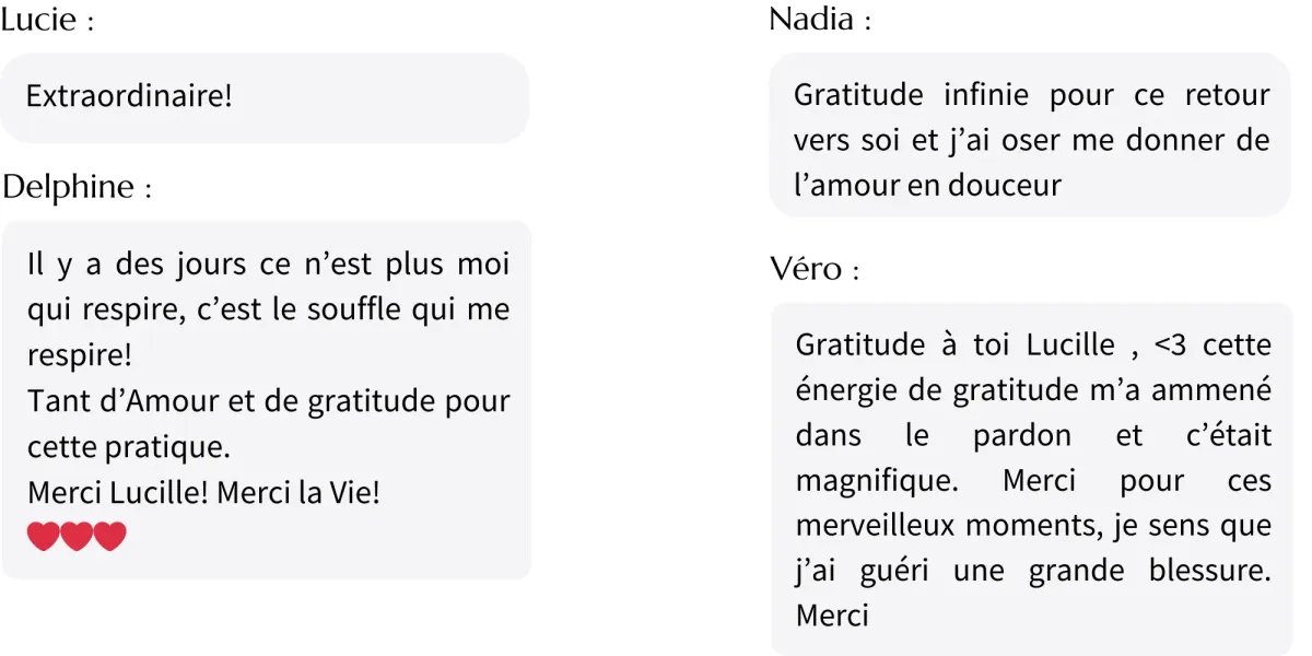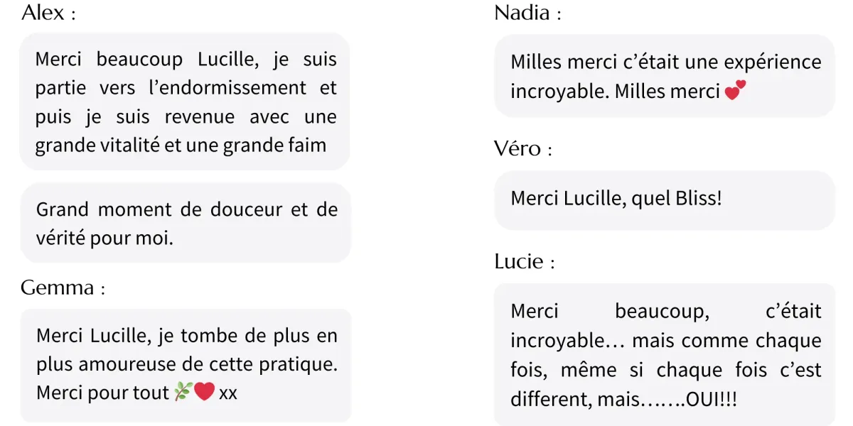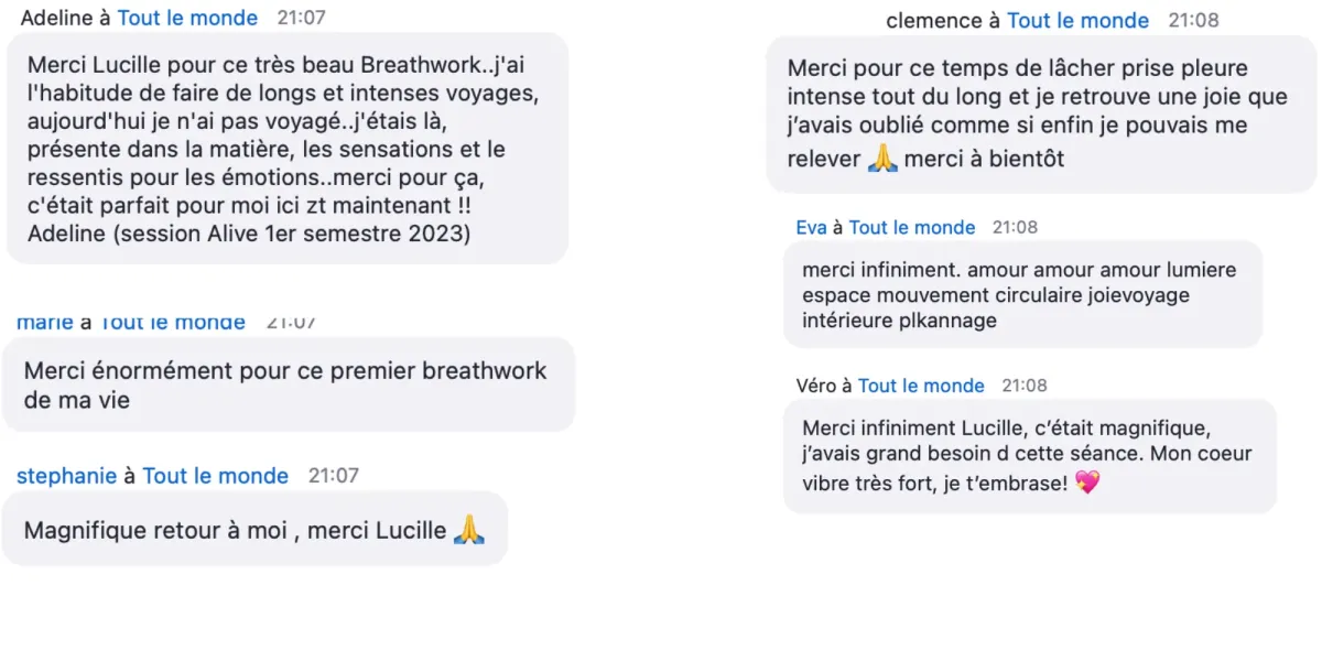Les séances sont guidées par Lucille, fondatrice de Alive Breathwork et des praticiens certifiés Alive Breathwork.