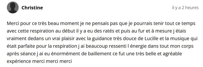 Vous pouvez absolument venir pour une séance de temps en temps. Cela vous permettra de libérer des émotions, de recevoir ce qui est juste pour vous dans le moment. Pour un travail plus profond je recommande 10 séances hebdomadaires, c’est ce qui vous permettra de vraiment libérer et intégrer tout ce qui vous limitait, de retrouver votre pleine respiration et votre plein potentiel. Vous pouvez aller encore plus loin en pratiquant en individuel et en présentiel, pour cela vous allez voir nos praticien(ne)s certifié(e)s.