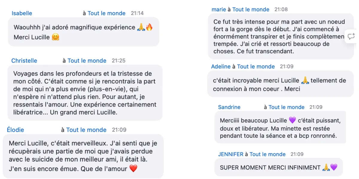 Chaque session est unique et différente. L’expérience peut être subtile ou très puissante, elle peut être physique, émotionnelle, énergétique, il peut y avoir des prises de conscience. Elle montre toujours quelque chose de nous à intégrer.
